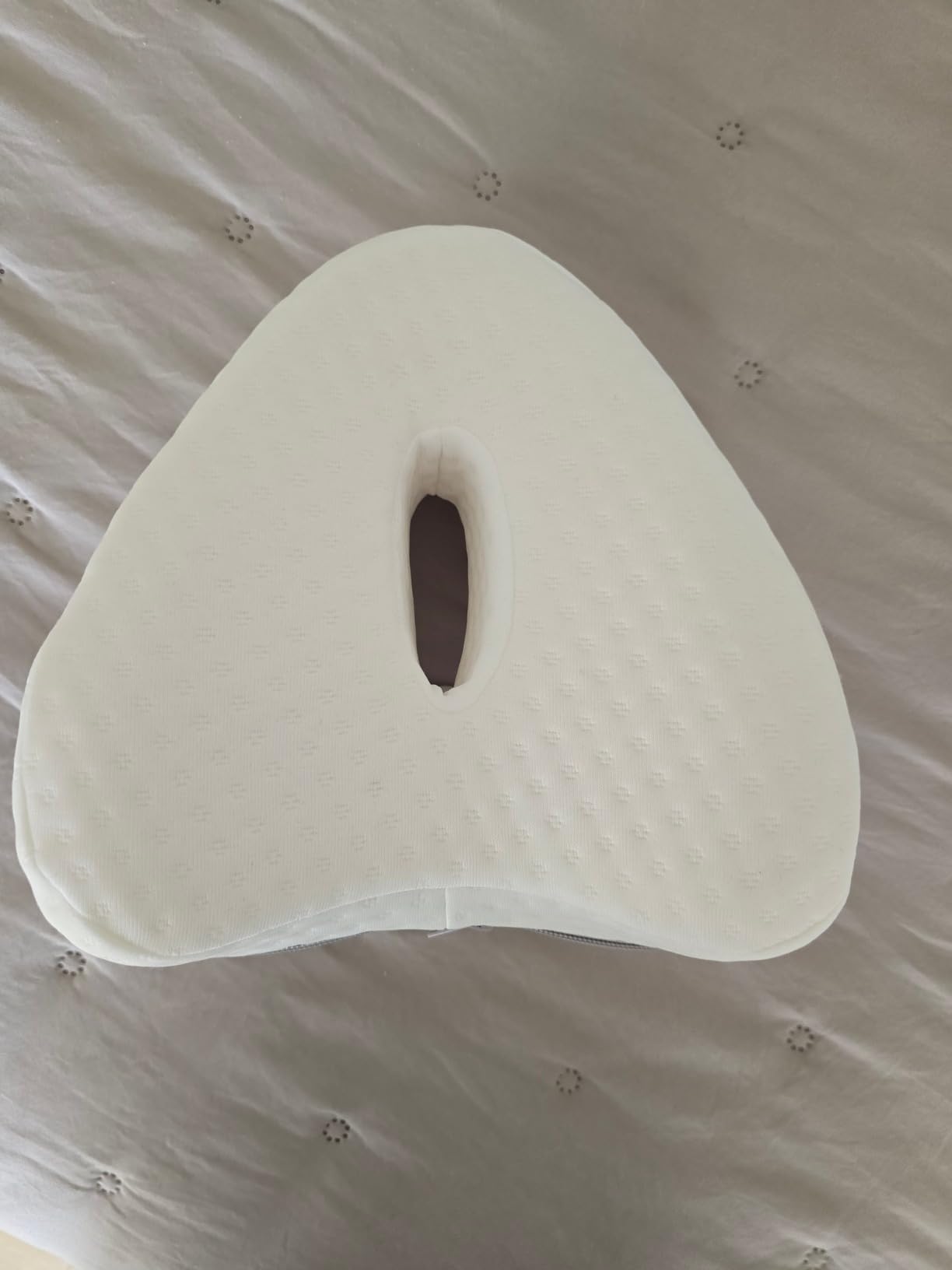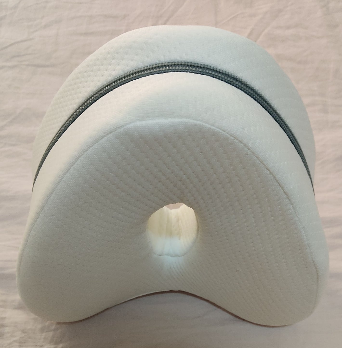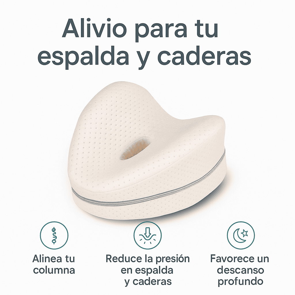 La almohada mantiene tus piernas en la posición ideal durante la noche, evitando la compresión del nervio ciático y reduciendo la presión sobre la espalda, lo que alivia el dolor lumbar y mejora el descanso.
